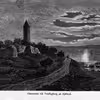 Koloreret tryk af gåsetårnet, slotsruinen og noret.