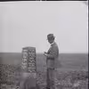Kilometersten. (vejvisersten)., Hat- og jakkeklædt herre - amtsvejinspektør Rasmussen i Sorø Amt- betragter stenen.