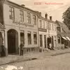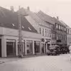 Storegade i Stege. Nederste del med Hotel Møen til højre og til venstre med Hansen Rex Fodtøjs forretning og F. Thomsen Beslag og Smedeværksted. Cykelværksted i gården