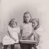 Agnes, Hansine og Ole Olesen samt Ruth Petersen, Dybvigvej 47, Fejø, cirka 1948