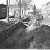 Fjernvarmearbejde på Frederikstorv, gravearbejdet er i gang, lastbiler på torvet. Niels Ebbesens Gade ses i baggrunden.