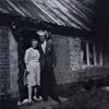 Sølvbrudeparret Linde i æresporten på gården, Stausholm. 1962.