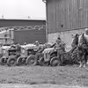 Ansatte på Schackenborg opstillet med godsets traktorer og heste foran Røjs avlsbygninger. Ca. 1959