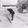 Gammel Torv begravet i sne, set mod Østerågade. Mænd skovler sne.