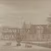 Høhøsten er ved at blive forket ind gennem loftsvinduerne i to gavlhuse. I forgrunden H.G.Sehestedts møbelfabrik.