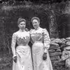 To unge kvinder i hvide kjoler, stående i en have.