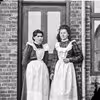 To unge piger med store hvide forklæder ved en dør.
