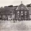 Rathlousdal. Hovedbygning set fra syd. Udsnit. Herskab og gæster kører på fisketur.
