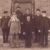Rathlousdal. Smedie og beboelseshus. Fra v. med Jørgen Laursen, evt. skovfoged Martin Schleicher, smedelærling, smed Johannes Laursen.