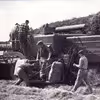 Rathlousdal. Mejetærsker med mandskab i gang med høsten.