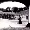 Rathlousdal. Del af hovedbygning og østlige avlsbygninger set gennem sydlig portal. På gårdspladsen grevinde Karen Grote.