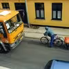 Den lille møder den store. Cykel med anhænger og renovationsbil i Storegade, Grenaa