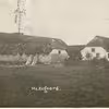Høstbillede. Niels Brøndum er på traktoren og Aksel Brøndum står op på selvbinderen.Billedet er taget fra øst, og i venstre side kan ses Sdr. Tranders Bygade og taget på "Krogården".