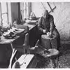 Træskomand Johan Nielsen fra Glarbo siddende ved huggeblokken i træskoværkstedet