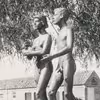 Skulpturen Dreng og Pige, kaldet Adam og Eva med den gamle toiletbygning på Ørnevejens Skole i baggrunden.