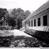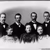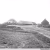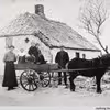 Familie ved hestekøretøj foran stråtækt hus, Volsted Kær ved Lindenborg å.