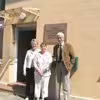 S/h af Kirstine og Valdemar Skjoldager Nielsen med hunden Teddy foran Bastrup skole