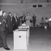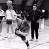 I Morten Børup Hallen - tv. ses Richard Fløe, i luften Jens Kr. Rasmussen - Hans Buttenschøn, i mørkt tøj, ser på.