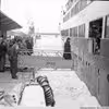 Aalborg Havn, rutebåden Aalborghus, lægger til kaj. Havnearbejdere skubber isen væk med lange stager.