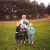 Dagplejebørn i Gærum som indianere sammen med dagplejemor Gerda Jensen ved spejderhytten, 28-09-1988.