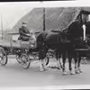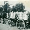 Optog gennem Adelgade i Nysted med hestevogn ført af Frede Jensen og på vognen bl.a. elever fra Nysted Efterskole