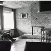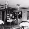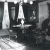 Theisens gård, interiør i gamle hus, salen med armstol ved sokkelbord, mørke vintergardiner for vinduerne mod torvet