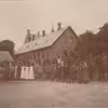 Medarbejdere på Lystrup Avlsgård fotograferet foran tjenestefløjen, ca. 1907.