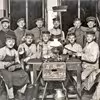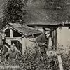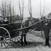 To børn i hestevegn fotograferet foran gården