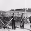 Frihedskæmpere ved minefelt og vejspærring ved Horne Kirke med præstegården i baggrunden