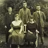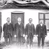 Fem alvorlige mænd foran et hus.