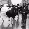 Sortbroget ko i Adelgade med reklame for ko-lotteri ved et kræmmermarked.