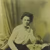 Ung kvinde i mørk kjole foran en ladeport.