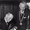 Kong Frederik indskriver sig i Nakskov by´s gæstebog i anledning af Nakskov By´s 700 års jubilæum Borgmester Carl Emil Hansen ser på.