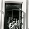 Skovshoved Skole set mod hjørnet af Teglgårdsvej og Korsgårdsvej med en flok skolebørn stående foran skolen