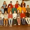 Gruppebillede med lærer Henny Willemoes omgivet af skoleelever fra en af de ældre klasser fra Skovshoved Skole