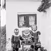 Tre små børn fotograferet ved hjørnet af et stråtækt hus.