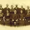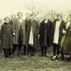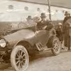 Flot åben gammel bil med rattet i højre side samt 5 voksne og 1 barn ved Hals Ladegård.