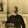 Skolebestyrer, titulær professor H.C. Frederiksen , kaldet Friser, på talerstolen på sin skole, i dag Ordrup Gymnasium.