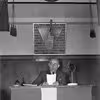 Mand på talerstol, prydet med Dannebrog, ca. 1945