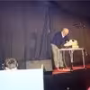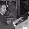 Mand ved kasseapparat, revyen, Harboøre, 1996.