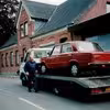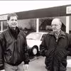 Autoforhandler Leif Stenderup og søn samt en Lada foran kontorbygningen på Industrivej 28, Ribe.