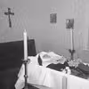 i en kiste. Der ståt store candelabre på begge