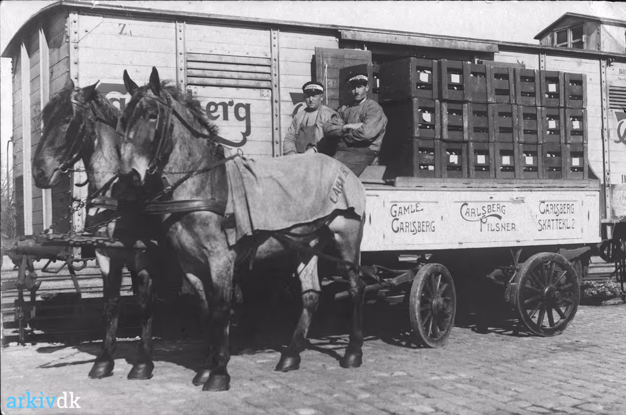 Carlsberg-hestevogn fra Odense-depot. Depotindehaver Peder Pedersen ses til venstre.