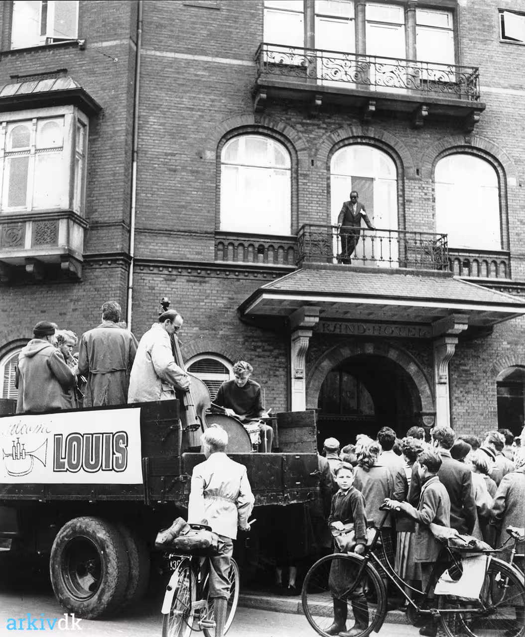 Fra altanen på Grand Hotel lytter Louis Armstrong i 1955 til odeseanske jazzmusikere fra Kardinalerne og Harlem Jazz Band. Armstrong spillede for fulde huse ved to koncerter i