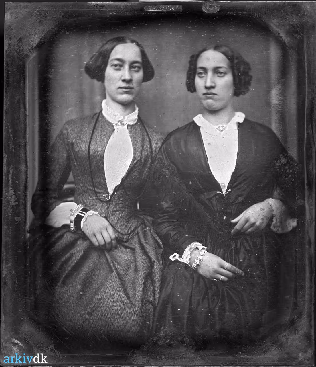 Daguerreotypi med portræt af to yngre kvinder, antagelig to søstre og døtre af major Johan Frederik Neckelmann i Fredericia. Ved sammenligning med B23277 er pigen t.v. efter alt at dømme frk. Anna Neckelmann (=? Ane Katrine Schalostica Neckelmann f. 1824) og pigen t.h. antagelig Ketty Kristiane Neckelmann (f. 1830). |