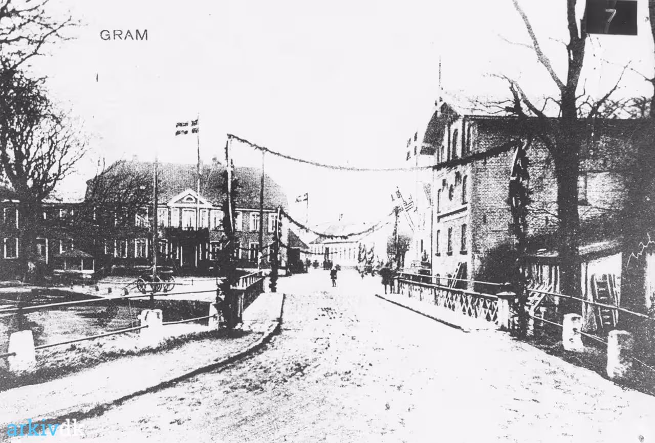 Kopi af foto fra området omkring Slotskroen. Gram Elektricitetsværk, Slotsvej 49 C, og Den Gramle Kro, Slotsvej 47, Gram. |
