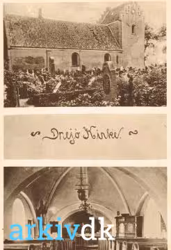 1) 2 motiver på 1 kort. Drejø Kirke udefra og fra kirkeskibet.o.1930. Fotograf: H. Schmidt, Linneallé 5, Odense. På de 3 andre andre står: Parti fra Drejø. De er muligvis fra omkring 1930érne. Ingen fotograf angivet. 2) Kik ud over mosen og Drejø By. 3) Kik mod Præstegården med Rasmus Hansens gård t.v. 4) Gaden med sognefogedgården i baggrunden. |