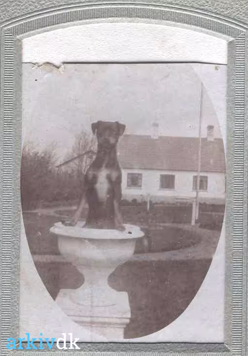 haven med gårdhunden i forgrunden. Gården nedbrændte helt marts 1911. Billedet er taget efter den var blevet genopført. Læs om gården og dens beboere i hæftet: Lunderød - en landsby i Tølløse sogn. |