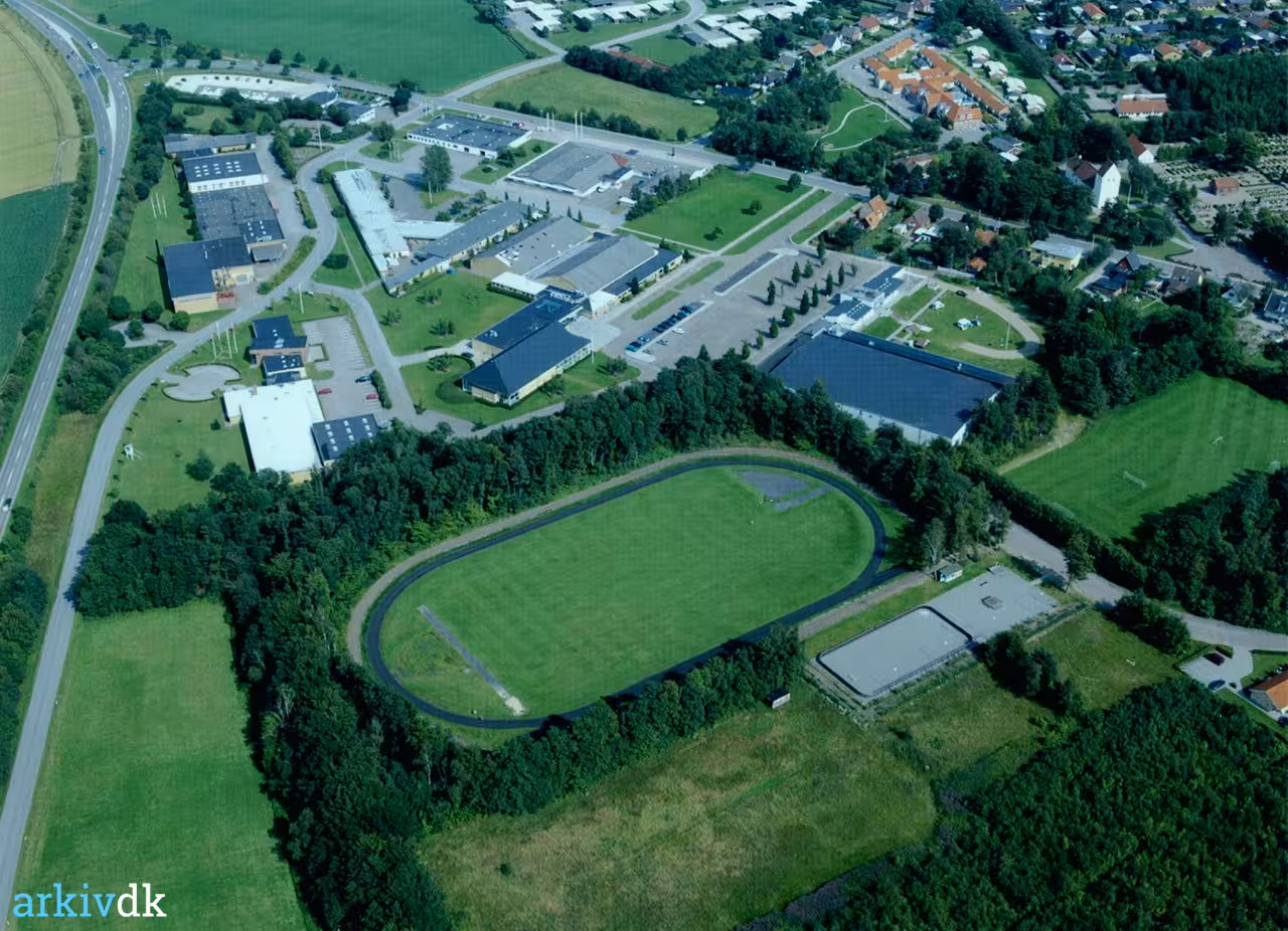 | Beskrivelse | Vojens. Luftfoto af området omkring Isstadion (blikskuret), Campingplads (tidligere friluftsbadet) og Vojens Hallerne med Svømmehal.