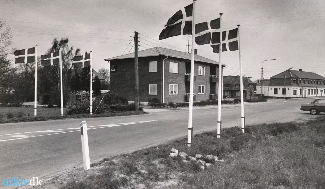 | Beskrivelse | Flagalleen indvies i St. Merløse. Midt i billedet ejendommen Holbækvej 1. T.h. i billedet Merløse Kro. |